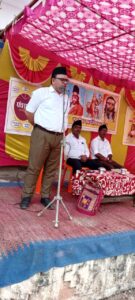 मुख्य वक्ता डॉ राजकुमार भारद्वाज विभाग प्रचारक रायगढ़ ने कहा कि संघ की स्थापना 27 सितम्बर सन् 1925 से प्रारंभ हुआ और तब से लेकर अब तक की राष्ट्रीय स्वयंसेवक संघ के उपलब्धियों के बारे में बताया, राष्ट्रीय स्वयंसेवक संघ हमेशा से ही देश हित के लिए कार्य करती हैं अब तक कई बार सेना की मदद करते हुए अपने कई स्वयं सेवकों की प्राणों की आहुति भी दे चुकी है तथा वर्तमान समय में राष्ट्रीय स्वयंसेवक संघ की देश को आवश्यकता क्यों है उसे बताया, आज संघ शताब्दी वर्ष में प्रवेश कर रहा है, जिसमें स्वयं सेवकों द्वारा पञ्च प्रण लिया गया है जिसमें 1. सामाजिक समरसता के बारे में बताया की छुआ- छूत के भावनाओं को छोड़कर सभी को समान व्यवहार करना चाहिए 2. कुटुम्ब प्रबोधन में अपने पूरे परिवार को साथ में बैठ कर खाना खाना चाहिए साथ मिलकर रहना चाहिए 3. पर्यावरण संरक्षण आज हम नौरात्रि का उपवाश 9 दिन बिना खाए रह सकते हैं लेकिन बिना हवा के कुछ छड़ भी जीवित नहीं रह सकते जिस कारण इस पर्यावरण का संरक्षण बहुत आवश्यक है 4. स्व के बोध व स्वदेशी को मान कर मातृ भाषा, और स्वदेशी वस्तुओं को अपनाना चाहिए 5 नागरिक कर्तव्य बोध प्रत्येक नागरिकों के मूल कर्तव्य और देश भक्ति देश की संस्कृति को जानने और उसका पालने करने का महत्व को बताया संघ विश्व का सबसे बड़ा संगठन बनकर तैयार हुआ है, आज देश में राष्ट्र विरोधी शक्तियां समाज को खंडित करने के प्रयास में लगा है ऐसे समय में हमें एक साथ इस संगठन के माध्यम से ताकतवर व सशक्त होकर एक साथ चलने की आवश्यकता है संघ संस्कार ,अनुशासन और देशभक्ति के रूप में कार्य कर रहा है इस अवसर पर अमृतवचन सुमित गबेल और एकलगीत सुरेश साहू द्वारा किया गया एवं क्षेत्र के स्वयंसेवकों और ग्राम वासियों की गरिमामई उपस्थिति रही।