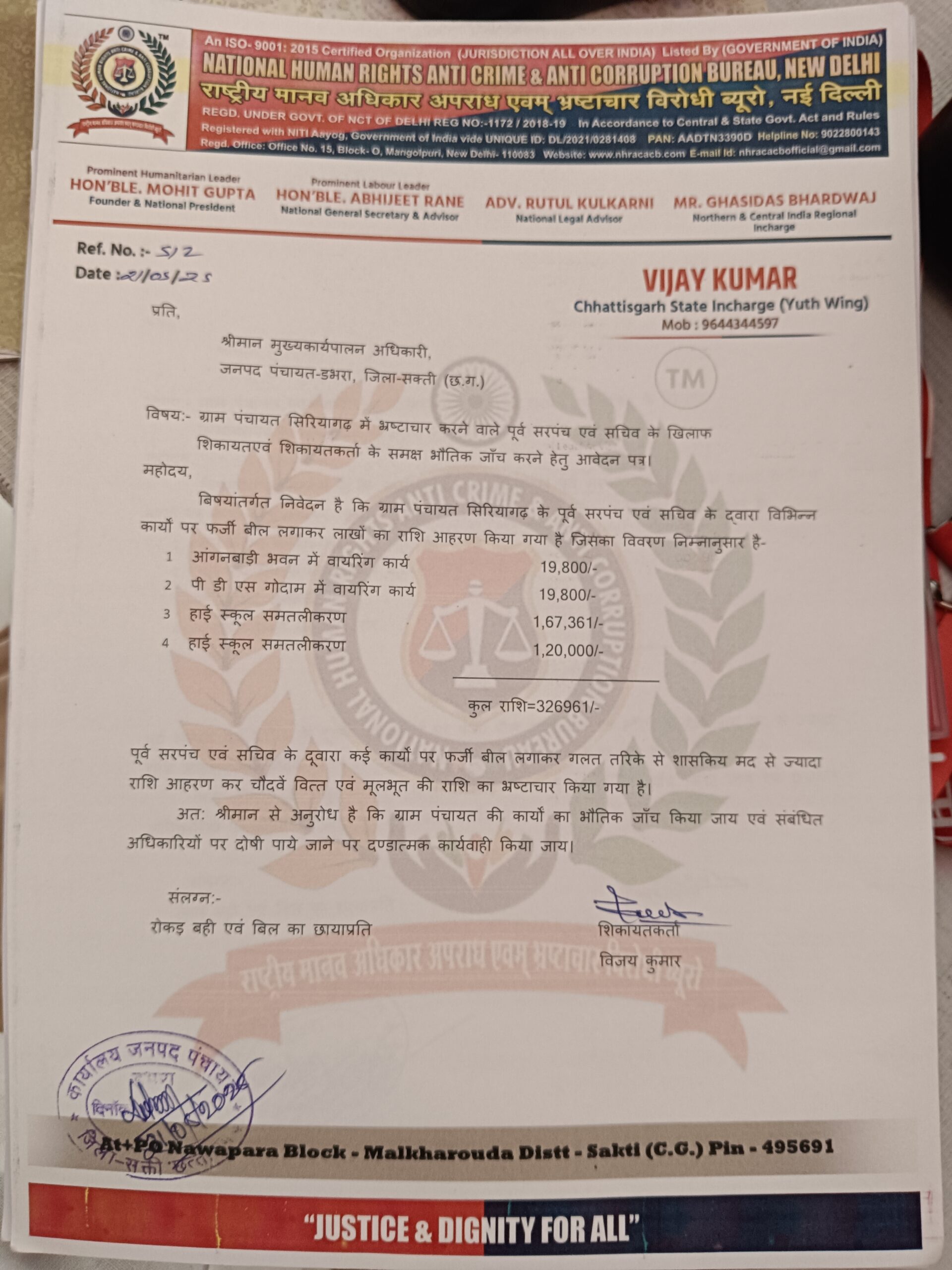 डभरा जनपद पंचायत अन्तर्गत आने वाले ग्राम पंचायत सीरियागढ़ में लाखों के भ्रष्टाचार