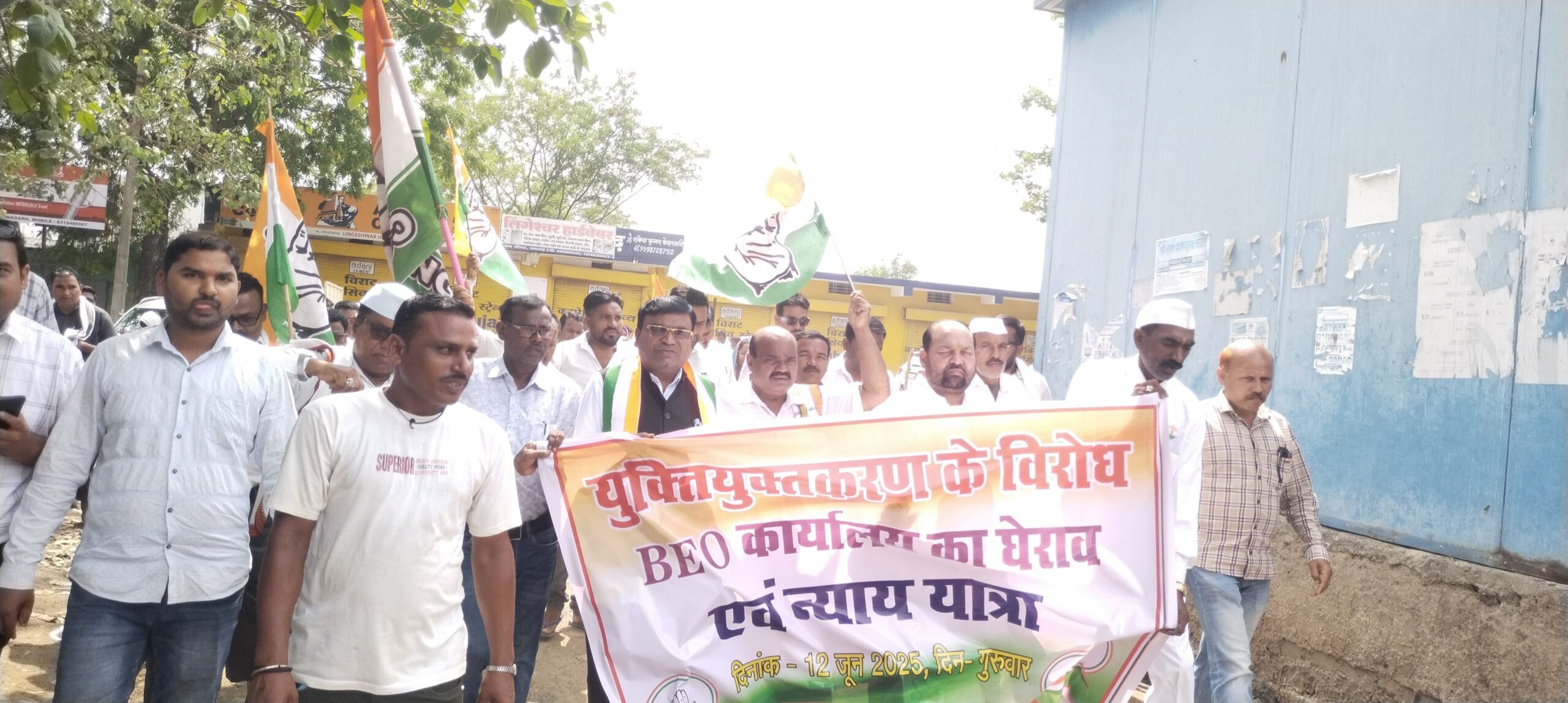 जांजगीर चांपा। छत्तीसगढ प्रदेश कांग्रेस कमेटी के आह्वान पर ब्लाॅक कांग्रेस कमेटी नवागढ़ के द्वारा शिक्षकों के युक्तियुक्तकरण के विरोध में विकासखंड शिक्षा अधिकारी कार्यालय का घेराव एवं शिक्षा न्याय यात्रा का आयोजन किया गया।