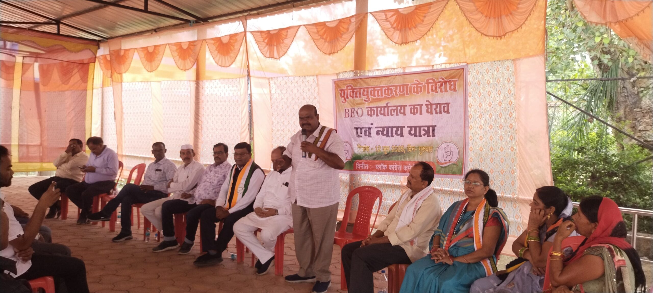 ब्यास कश्यप ने बताया कि छत्तीसगढ़ सरकार के द्वारा शिक्षकों एवं विद्यालयों का युक्तियुक्तकरण किया जा रहा है। एक सुनियोजित षडयंत्र के तहत शिक्षकों की सीधी भर्ती को रोकने तथा विभागीय व्यय भार को कम करने के लिए युक्तियुक्तकरण की कार्यवाही की जा रही है। विधानसभा में दिये गये जानकारी के अनुसार प्रदेश में शिक्षकों के 56601 पद रिक्त हैं। भाजपा के घोषणा पत्र में भी इन्होंने मोदी की गारंटी के तहत 56000 शिक्षकों के रिक्त पदों पर सीधी भर्ती करने का वादा किया था किन्तु आज प्रदेश में इसके उलट कार्यवाही देखने को मिल रही है। युक्तियुक्तकरण के इस कार्य में पूरे प्रदेश में भर्राशाही, भारी लापरवाही, नियमों की अनदेखी कर, प्रशासनिक दबाव डालकर शिक्षकों का जबरिया स्थानांतरण किया जा रहा है, वहीं कई स्कूलों को मर्ज करने के नाम बंद किया जा रहा है। कई जिलों के विकासखंड शिक्षा अधिकारियों को निलंबित किया जाना इस बात का प्रमाण है कि इस कार्य में घोर लापरवाही बरती गई है। पूरे प्रदेश में बवाल मचा हुआ है तथा लालफीताशाही चरम पर है। इसी के विरोध में प्रदेश कांग्रेस कमेटी के आह्वान पर एवं जिला कांग्रेस के निर्देश पर नवागढ़ ब्लाॅक कांग्रेस कमेटी के द्वारा आज दिनांक 12.06.2025 को विकासखंड शिक्षा अधिकारी कार्यालय का घेराव किया गया।