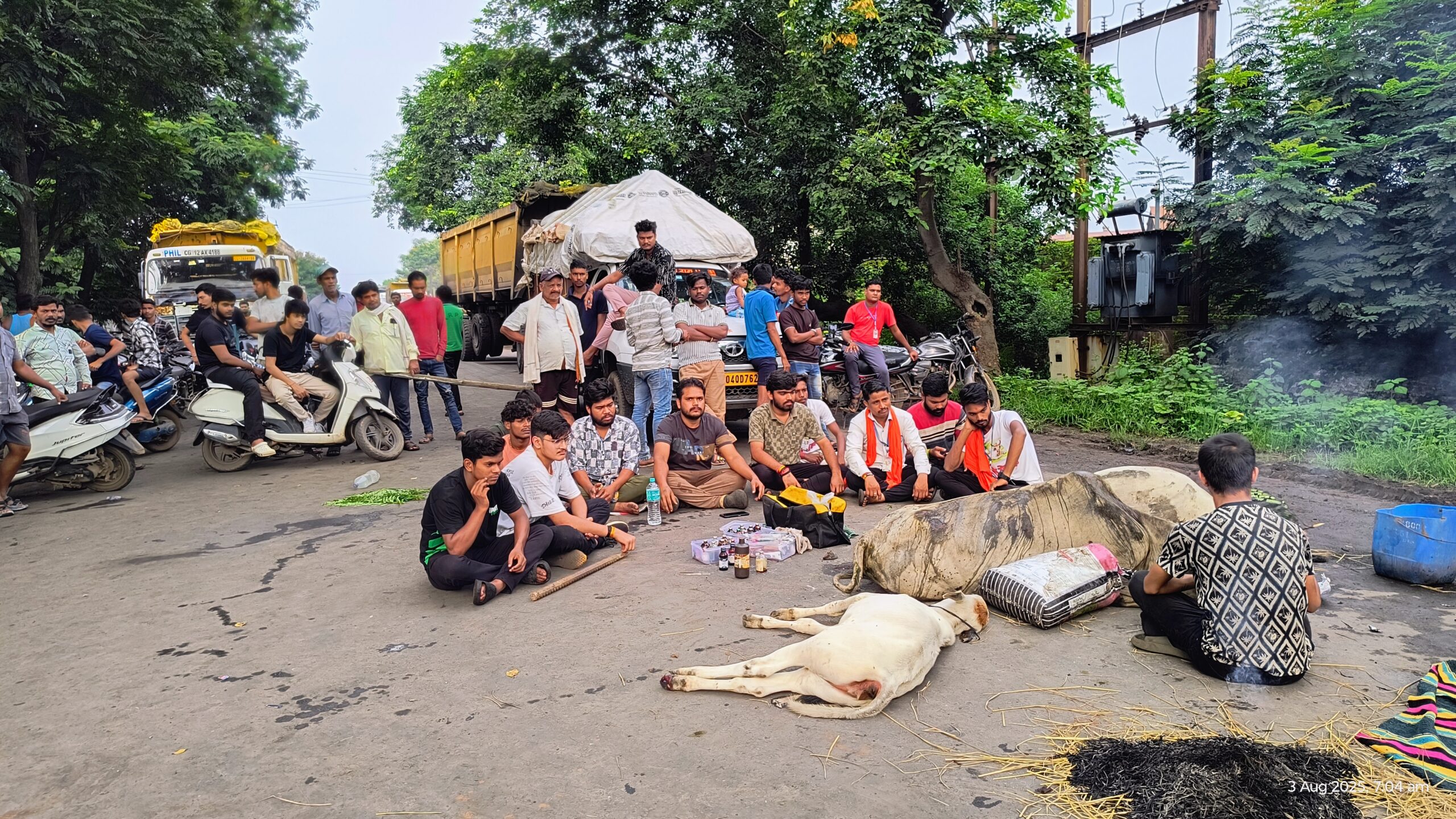 खरसिया रायगढ़ रोड पंचमुखी मंदिर पर तेज रफ्तार ट्रेलर ने गाय को कुचला दो की मौत एक बुरी तरह जख्मी गौ सेवा संगठन ने किया चक्का जाम रात्रि 12:00 बजे एक अज्ञात तेज रफ्तार टेलर ने रोड किनारे बैठे गायों को कुचला कर निकला जब इस बात की गौ सेवा संगठन को सूचना जानकारी मिली तो विगत रात्रि में ही गौ सेवा संगठन के सक्रिय वैभव साव के साथियों ने रात्रि में ही रोड में चक्का जाम किया 10 किलोमीटर से भी ज्यादा चक्का जाम लगा हुआ है आवा गमन पूरी तरीके से प्रभावित है जब गै सेव संगठन के सक्रिय वैभव साव से जब बात की गई तो बताया कि तेज रफ्तार ट्रेलर जो हमारी मां को कुचला है चालक और मालिक के ऊपर कठोर कार्रवाई हो जब तक हमें न्याय नहीं मिलेगा तब तक रोड प्रभावित रहेगा हम गौ माता के साथ समझौता नहीं कर सकते जब तक हमें ठोस आश्वासन और कार्रवाई नहीं होगा तब तक हम सभी गै सेवा अपनी मांग पर अडिग रहेंगे और रोड पर बैठे रहेंगे एवं रोड परिवहन विभाग रोड पर रेडीमेड लाइट फॉर इंडस्ट्री लाइट लगे और तेज रफ्तार ट्रेलर को शहर और गांव क्षेत्र में अपनी तेज रफ्तार टेलरों को धीमी गति से चलाएं। और शासन से मांग है कि गौ माता के लिए समुचित व्यवस्था करये विगत विगत रात्रि से हम लोग 12:00 से गौ सेवा संगठन लोग बैठे हैं लेकिन प्रशासन शासन का कोई फोन ना आश्वासन नहीं आया है क्या अधिकारी कर्मचारी और शासन गौ माता बे रहीम है गौ सेवा आयोग इस तरह की घटनाओं पर कठोर मीना नहीं लगा और समुचित व्यवस्था नहीं करेगा तो गौ सेवा आयोग को खत्म कर देना चाहिए। जब तक हमारी मांग और गौ माता के प्रति न्याय नहीं होगा तब तक हम गांव सेवा संगठन सड़क पर बैठे रहेंगे।