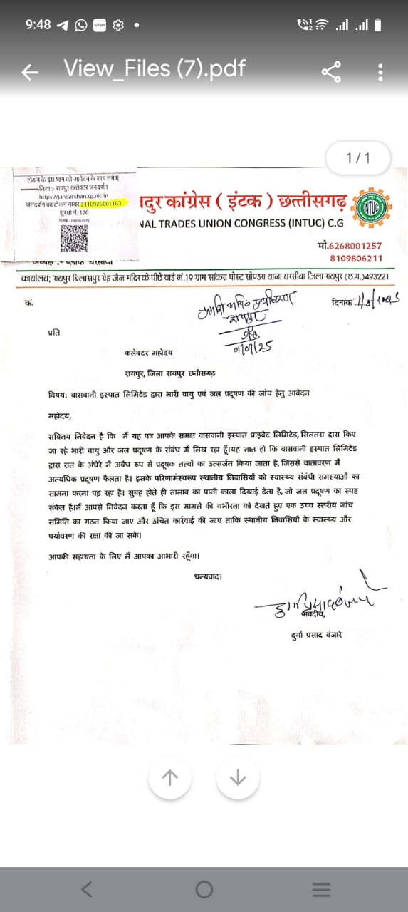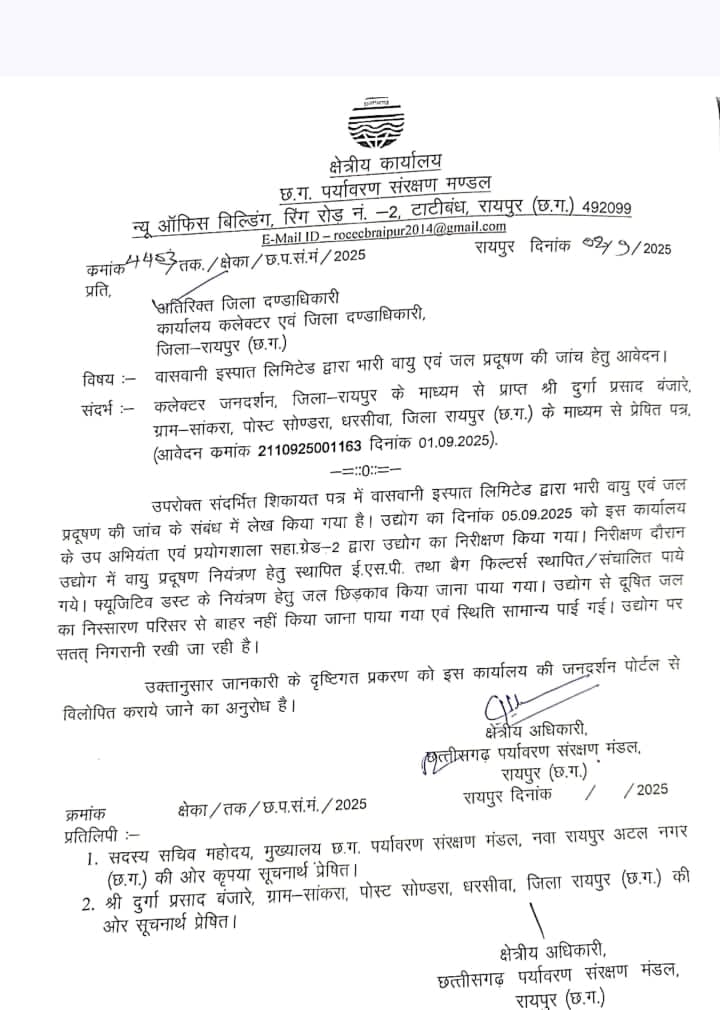 उपरोक्त संदर्भित शिकायत पत्र में वासवानी इस्पात लिमिटेड द्वारा भारी वायु एवं जल प्रदूषण की जांच के संबंध में लेख किया गया है। उद्योग का दिनांक 05.09.2025 को इस कार्यालय के उप अभियंता एवं प्रयोगशाला सहा. ग्रेड-2 द्वारा उद्योग का निरीक्षण किया गया। निरीक्षण दौरान उद्योग में वायु प्रदूषण नियंत्रण हेतु स्थापित ई.एस.पी. तथा बैग फिल्टर्स स्थापित / संचालित पाये गये। फ्यूजिटिव डस्ट के नियंत्रण हेतु जल छिड़काव किया जाना पाया गया। उद्योग से दूषित जल का निस्सारण परिसर से बाहर नहीं किया जाना पाया गया एवं स्थिति सामान्य पाई गई। उद्योग पर सतत् निगरानी रखी जा रही है।
