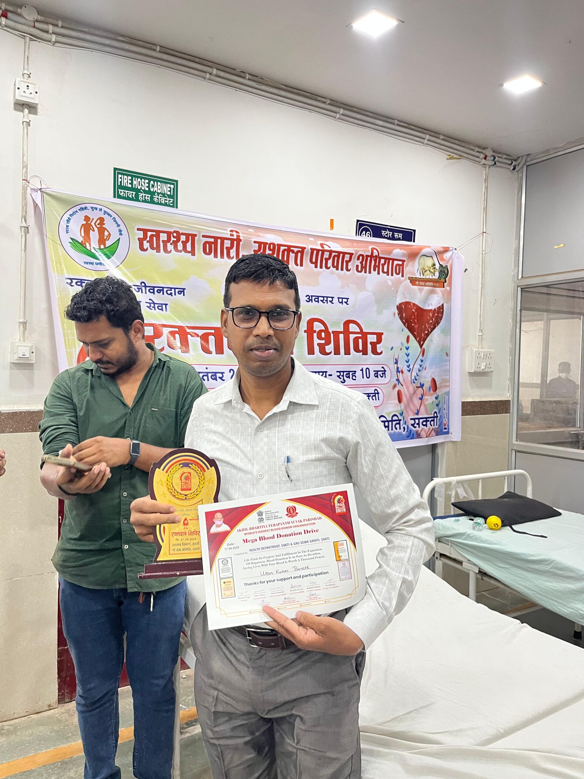 सक्ती। रक्तदान को हमारे देश में महादान के नाम से जाना जाता है, इसी तारतम्य में आज 17 सितंबर 2025 को सक्ती जिले के सामुदायिक स्वास्थ्य केंद्र सक्ती में रक्तदान शिविर का आयोजन किया गया जो कि गौ सेवा समिति सक्ती के विशेष तत्वाधान में आयोजित किया गया, इसी कड़ी में आज इस रक्तदान शिविर में सक्ती जिले के संभागीय कार्यालय के तकनीकी शाखा प्रमुख के रूप में पदस्थ उप अभियंता विकास कुमार राठौर ने अपनी 9 वीं बार रक्तदान किया है, इनके साथ सहायक ग्रेड 03 श्री उत्तम बरेठ जी भी मौजूद रहे , रक्तदान के बाद श्री राठौर ने बताया कि रक्तदान वास्तव में सबसे बड़ा दान माना जाता है, जब किसी जरूरतमंद को रक्त की आवश्यकता पड़ती है तो वहां व्यक्ति जाती धर्म लिंग नहीं देखता बस उन्हें रक्त मिल जाएगा जिससे उसका जान बच सके ऐसे महान कार्य के लिए सभी को बढ़ चढ़ कर आगे आना चाहिए। वहीं इस अवसर पर आयोजक गौ सेवा आयोग के द्वारा समस्त रक्तदाताओं का धन्यवाद ज्ञापित किया गया।
