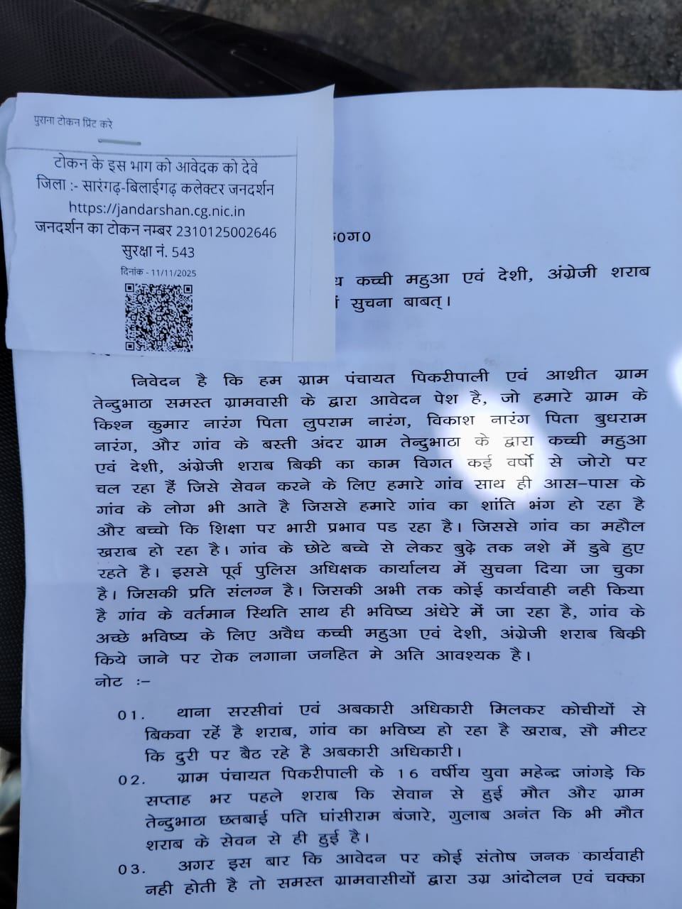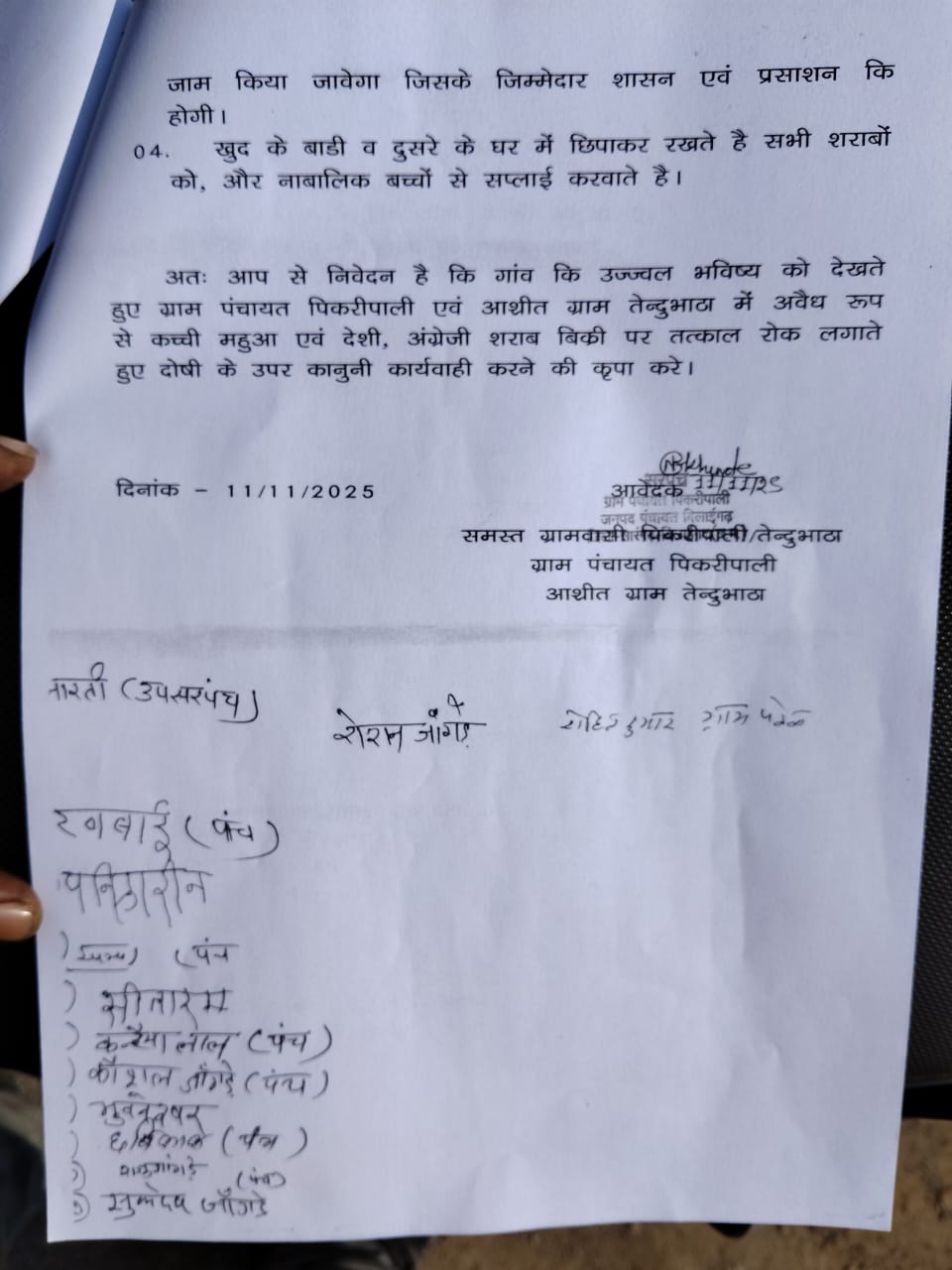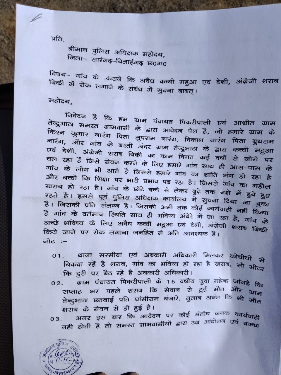 आवेदन में यह भी उल्लेख किया गया है कि अवैध शराब सेवन से गांव में कई लोगों की मौत हो चुकी है। हाल ही में ग्राम पंचायत पिकरीपाली के एक 16 वर्षीय युवक महेन्द्र बंजारे की संदिग्ध परिस्थितियों में मौत हो गई थी, जो नियमित रूप से शराब का सेवन करता था। इसके अलावा तेल्दुमभाठ निवासी घनश्याम बंजारे और गुलाब अनंत की भी मौत शराब पीने से जुड़ी बताई गई है। ग्रामीणों ने कहा कि अगर समय रहते इस अवैध कारोबार पर रोक नहीं लगाई गई, तो गांव में और भी भयावह स्थिति उत्पन्न हो सकती है।
