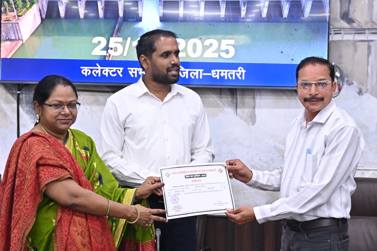 धमतरी कलेक्टर एवं जिला निर्वाचन अधिकारी अबिनाश मिश्रा ने मतदाता सूची विशेष संक्षिप्त पुनरीक्षण 2026 (एसआईआर) के तहत मतदाताओं को गणना प्रपत्र प्रदान करने एवं गणना प्रपत्रों को डिजीटाईज करने में उत्कृष्ट प्रदर्शन और शत्-प्रतिशत डिजिटाईजेशन के लिए जिले के 19 बीएलओ को आज कलेक्टोरेट सभाकक्ष में प्रशस्ति पत्र देकर सम्मानित किया। इस मौके पर अपर कलेक्टर रीता यादव, उप जिला निर्वाचन अधिकारी पवन प्रेमी सहित अन्य अधिकारी उपस्थित रहे।