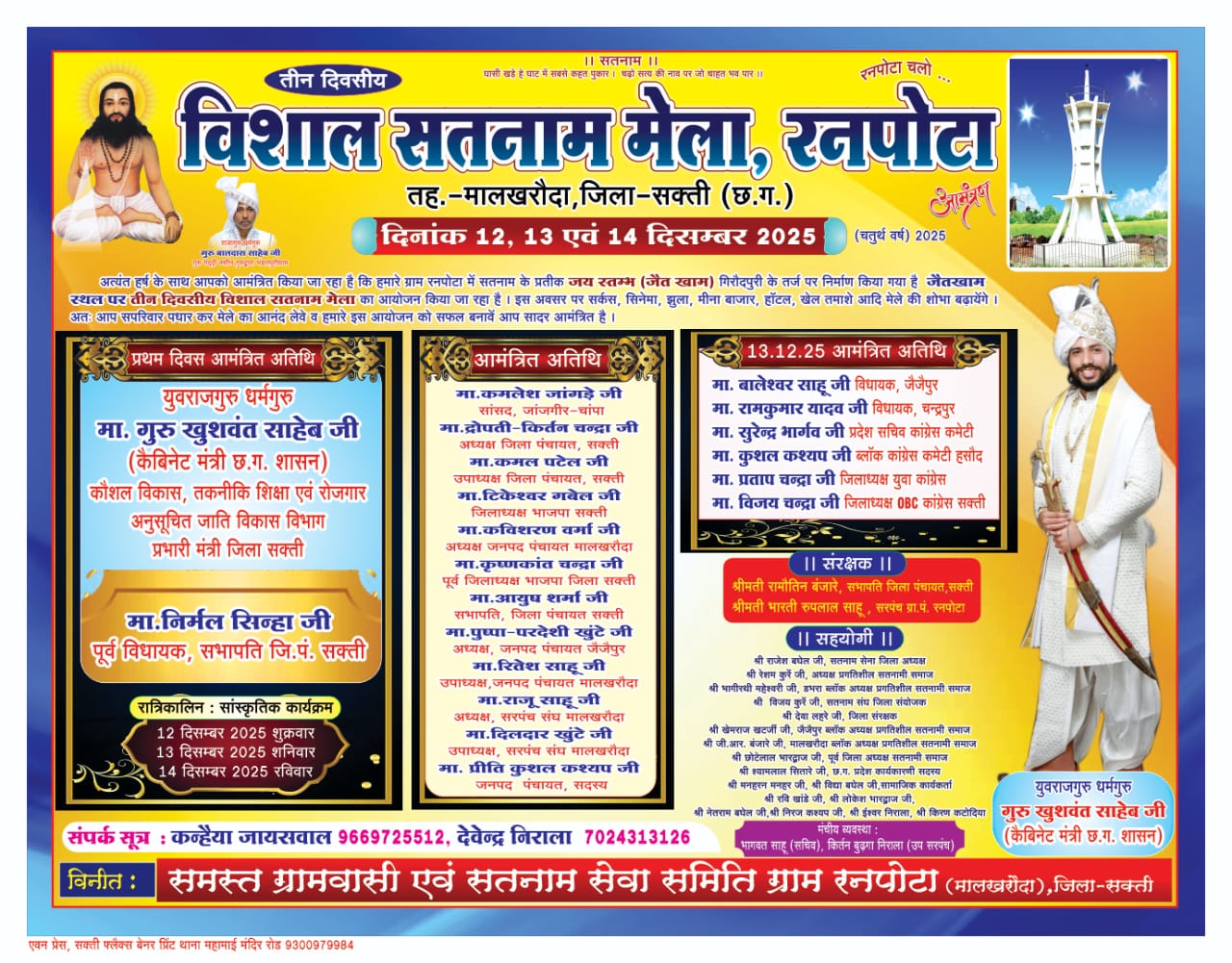 इस अवसर पर समिति की ओर से —ग्राम पंचायत सरपंच प्रतिनिधि अविनाश साहू,उपसरपंच प्रतिनिधि कीर्तन निराला, हरि जांगड़े, ठाकुर निराला, लक्ष्मण लहरें,सहित कन्हैया जायसवाल, देवेन्द्र निराला उपस्थित रहें। मेला समिति द्वारा दिए गए स्नेहमय आमंत्रण को मंत्री गुरु साहेब जी ने सहर्ष स्वीकार करते हुए मेला के सफल, भव्य और दिव्य आयोजन के लिए अपनी शुभकामनाएँ एवं आशीर्वाद प्रदान किए है साथ ही डभरा में आयोजित संविधान दिवस के मंच से गुरु साहेब जी ने उपस्थितजनों को ग्राम रनपोटा के इस विशाल सतनाम मेला के लिए आमंत्रित भी किए है। समिति ने समस्त ग्रामवासियों से आग्रह किया है कि आगामी तीन दिवसीय मेला में अधिक से अधिक संख्या में शामिल होकर समाज,सर्वसमाज एवं संस्कृति को समृद्ध करने में सहभागी बनें।*