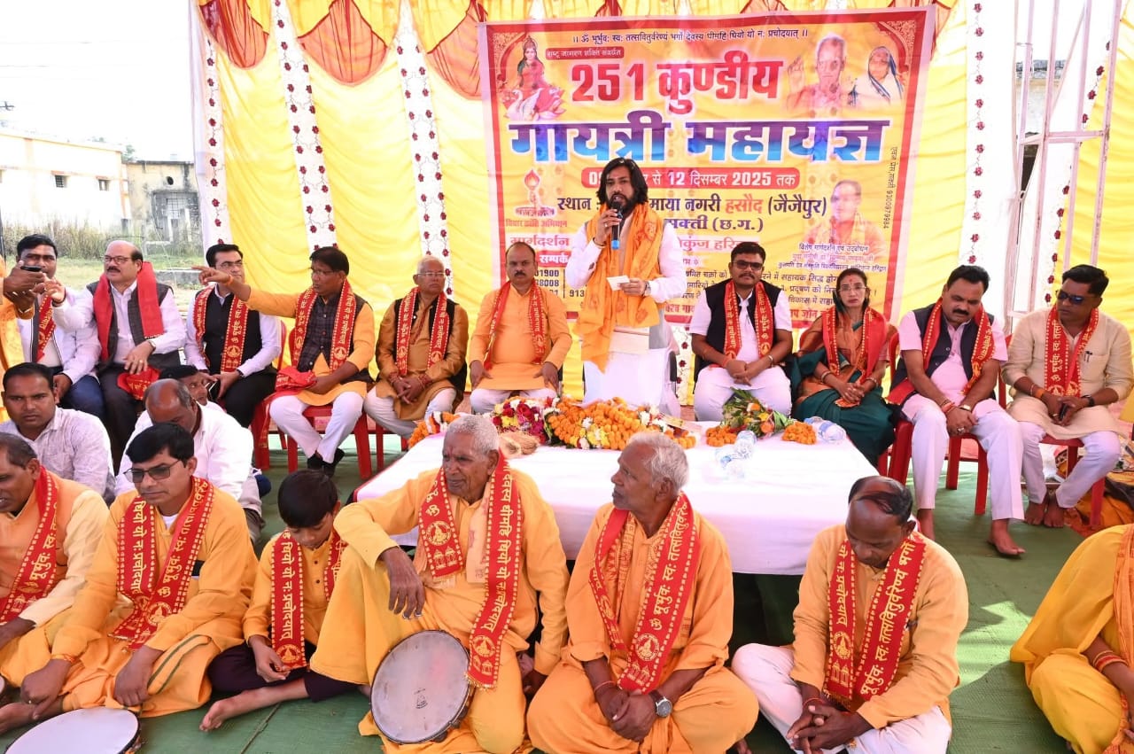 अखिल भारतीय विश्व गायत्री परिवार द्वारा मां महामाया नगरी हसौद में 9 से 12 दिसंबर 2025 तक आयोजित होने वाले 251 कुण्डीय गायत्री महायज्ञ के प्रमुख अनुष्ठान ज्वार बोआई में कैबिनेट मंत्री गुरु खुशवंत साहेब जी मुख्य अतिथि के रूप में शामिल हुए। मंत्री जी ने कहा कि यह महायज्ञ जन–जन में जागृति, संस्कार, सत्कार्य और सामाजिक समरसता की प्रेरणा देने वाला विराट आध्यात्मिक अभियान सिद्ध होगा। इससे पूरे क्षेत्र में शांति, समृद्धि व आध्यात्मिक ऊर्जा का सकारात्मक वातावरण प्रसारित होगा। कार्यक्रम में पूर्व विधायक श्री निर्मल सिन्हा जी, जिलाध्यक्ष श्री टिकेश्वर गबेल जी सहित गायत्री परिवार के सदस्य, भाजपा पदाधिकारी, जनप्रतिनिधि एवं गणमान्यजन उपस्थित थे।