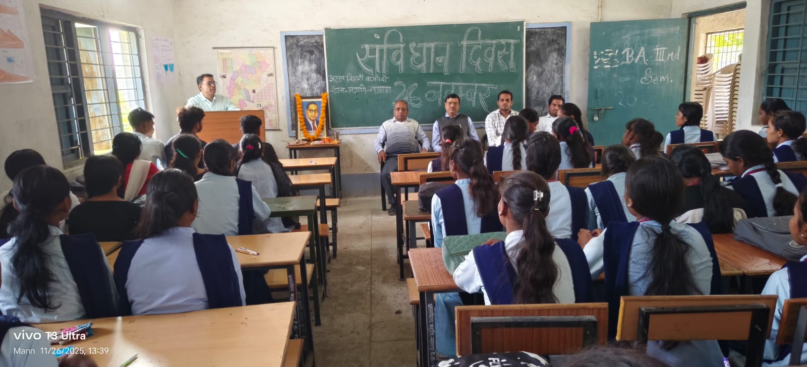 शहीद नंदकुमार पटेल विश्वविद्यालय रायगढ़ से सम्बद्ध अटल बिहारी वाजपेयी शासकीय महाविद्यालय नगरदा जिला सक्ती में दिनांक 26 नवंबर को संविधान दिवस कार्यक्रम का आयोजन किया गया। कार्यक्रम का शुभारंभ महाविद्यालय के प्राचार्य डॉ ए पी गोस्वामी एवं समस्त स्टाफ को सामूहिक रूप से डॉ भीम राव अम्बेडकर जी के छायाचित्र पर पूजा एवं फूल अर्पण के लिए आमंत्रित किया गया। तत्पश्चात महाविद्यालय के प्राचार्य द्वारा सामूहिक रूप से संविधान की प्रस्तावना की शपथ दिलवाया गया। जिसमे महाविद्यालय के समस्त स्टाफ और विद्यार्थियों शामिल हुए। डॉ अरविंद कुमार जगदेव ने अपने संबोधन में 26 नवंबर को संविधान दिवस इसलिए मनाया जाता है क्योंकि इसी दिन 1949 में भारत के संविधान को अपनाया गया था, और यह दिन हमें हमारे संवैधानिक मूल्यों व डॉ अम्बेडकर के योगदान की याद दिलाता है।डॉ. भीमराव रामजी अम्बेडकर (14 अप्रैल 1891 – 6 दिसंबर 1956) को आधुनिक भारत का सबसे महान संविधान-निर्माता, सामाजिक न्याय का प्रतीक और दलित-शोषित वर्गों का मसीहा माना जाता है। उनके योगदान को मुख्य रूप से निम्नलिखित क्षेत्रों में बाँटा जा सकता है।भारतीय संविधान के जनक संविधान सभा में प्रारूप समिति के अध्यक्ष थे।संविधान के लगभग हर महत्वपूर्ण प्रावधान में उनका प्रत्यक्ष या अप्रत्यक्ष योगदान था।उन्होंने 2 साल 11 महीने 18 दिन में संविधान का अंतिम प्रारूप तैयार करवाया। संविधान सभा में उनके कुल लगभग 120 भाषण हुए, जो सबसे अधिक हैं। महाविद्यालय के प्राचार्य डॉ ए पी गोस्वामी ने अपने संबोधन आज 26 नवंबर का दिन हमारे लिए केवल एक तारीख नहीं, बल्कि उस महान दस्तावेज की स्मृति है जिसने हमें एक स्वतंत्र, संप्रभु, लोकतांत्रिक और गणराज्य बनाया। आज हम संविधान दिवस मना रहे हैं – उस दिन की याद में जब सन् 1949 में हमारे संविधान सभा ने भारत के संविधान को अंगीकृत किया था। आज से ठीक 76 वर्ष पहले, 26 नवंबर 1949 को संविधान सभा के सभापति डॉ. राजेंद्र प्रसाद के सामने डॉ. भीमराव अम्बेडकर ने संविधान का अंतिम प्रारूप प्रस्तुत किया और सभा ने इसे औपचारिक रूप से अपनाया। 60 साल की गुलामी के बाद यह वह ऐतिहासिक क्षण था जब हमने अपने भाग्य का फैसला खुद अपने हाथ में लेने का संकल्प लिया। डॉ अमित कुमार तिवारी ने अपने संबोधन में मौलिक अधिकार हमें गरिमा और स्वतंत्रता देते हैं, तो मूल कर्तव्य हमें जिम्मेदार नागरिक बनाते हैं। बाबासाहेब अम्बेडकर ने कहा था “हमने राजनीतिक लोकतंत्र तो स्थापित कर लिया, अब हमें सामाजिक लोकतंत्र स्थापित करना है। यह तभी संभव है जब हम अपने अधिकारों की रक्षा के साथ-साथ अपने कर्तव्यों का भी पालन करें। आइए, हम सब संकल्प लें कि हम न केवल अधिकार माँगने वाले, बल्कि कर्तव्य निभाने वाले जागरूक ना