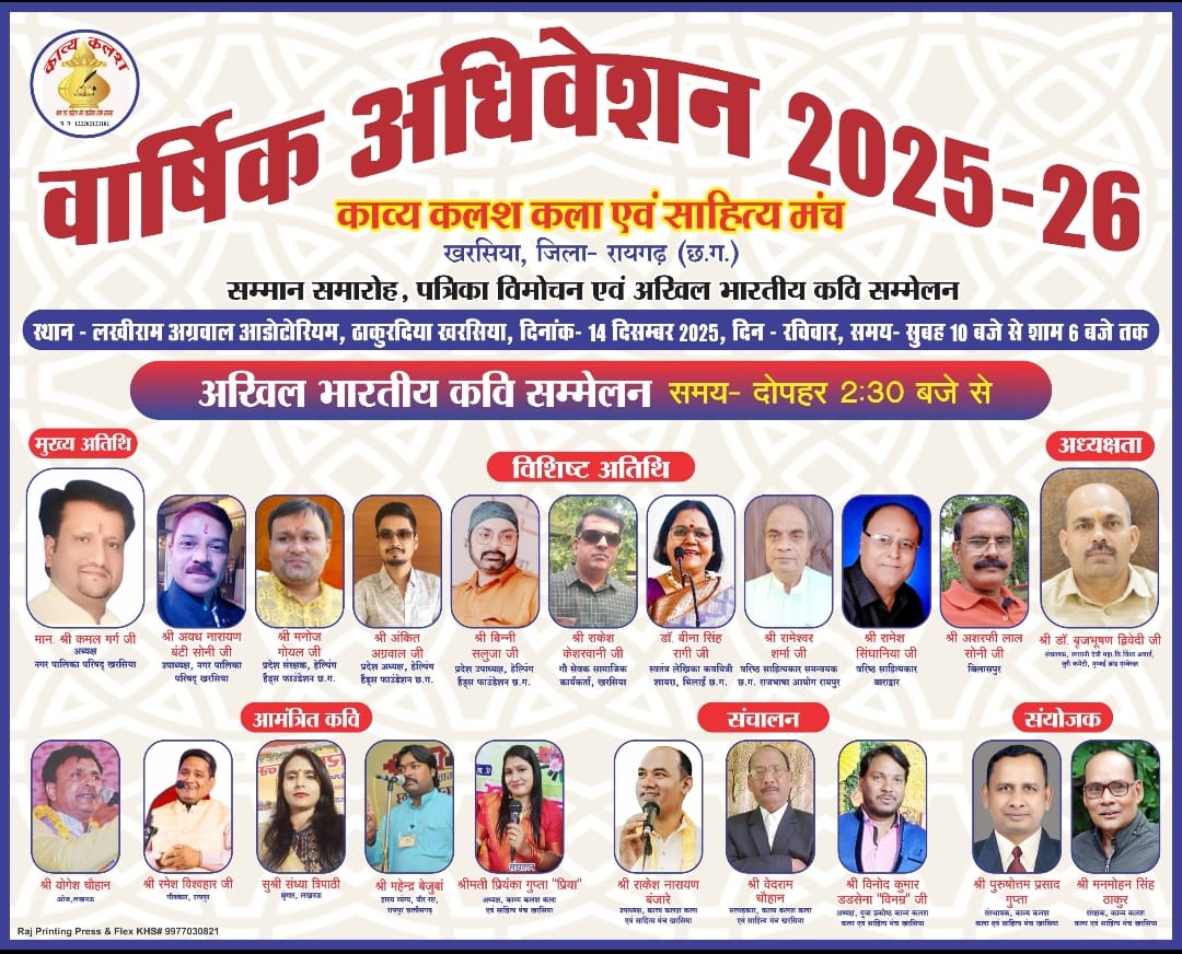 खरसिया | काव्य कलश कला एवं साहित्य मंच, खरसिया (जिला रायगढ़) द्वारा पंचम वार्षिक अधिवेशन, सम्मान समारोह एवं अखिल भारतीय कवि सम्मेलन का भव्य आयोजन 14 दिसंबर 2025, रविवार को लखीराम अग्रवाल ऑडिटोरियम, ठाकुरदिया खरसिया में होगा। कार्यक्रम प्रातः 10 बजे से शाम 6 बजे तक चलेगा। इस विशाल साहित्यिक महोत्सव में प्रदेशभर के साहित्यकार शिरकत करेंगे।