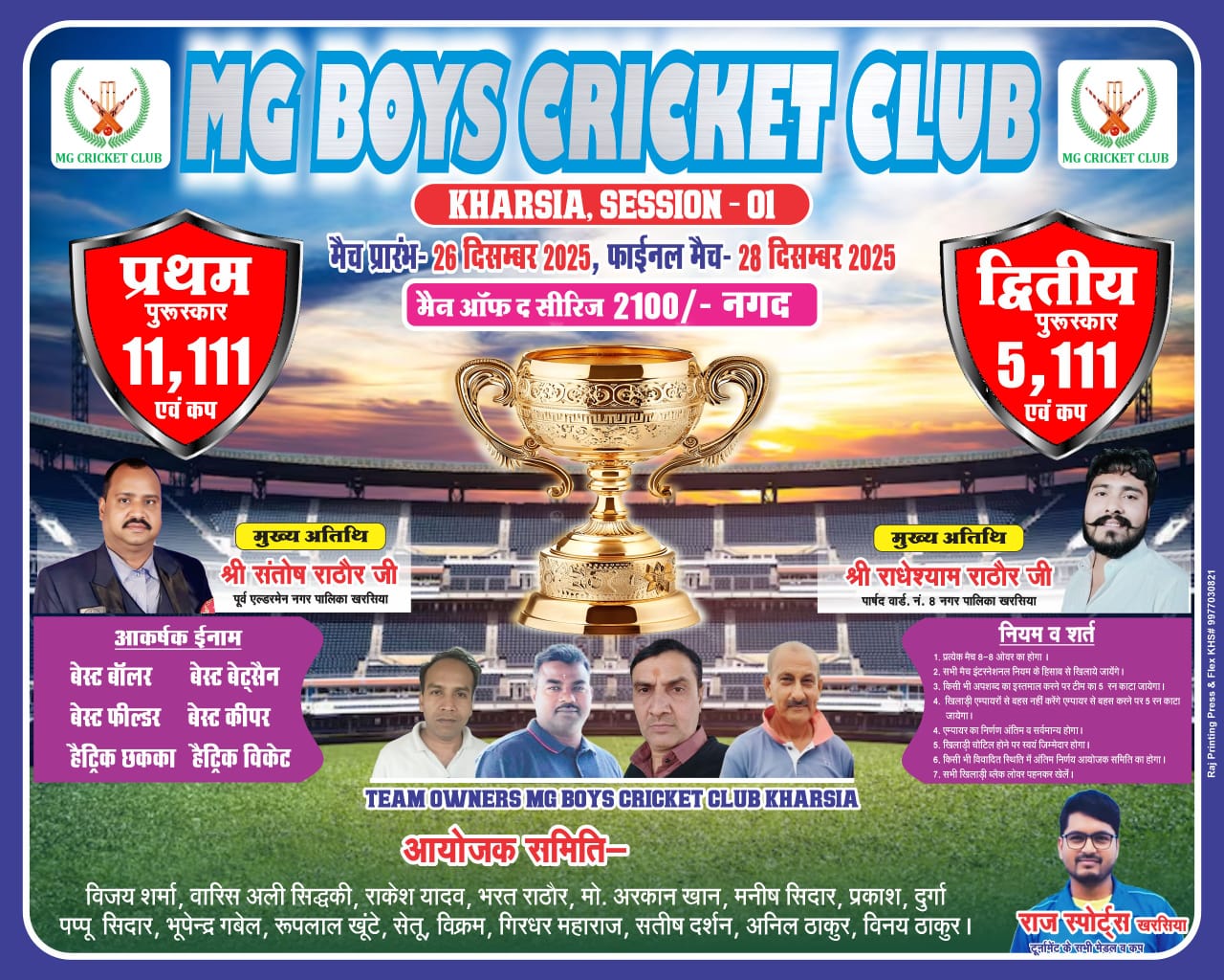 खरसिया*एमजी बॉयज क्रिकेट क्लब खरसिया के तत्वाधान में एमजीपीएल सीजन – 1 का आगाज 26 दिसंबर 2025 से सुबह 9 बजे से प्रारंभ हो रहा ,जिसमें समिति के सदस्य राकेश यादव ने बताया की इस प्रीमियर लीग में चार टीम भाग लेंगे जिसमें चार ओनर होंगे जिसके ऑनर इस प्रकार हैं, टी राजेश कुमार अन्ना , गौतम शर्मा, शरद सिंह, प्रदीप कुमार यह चार ओनर जो टीम का नेतृत्व करेंगे ।*
