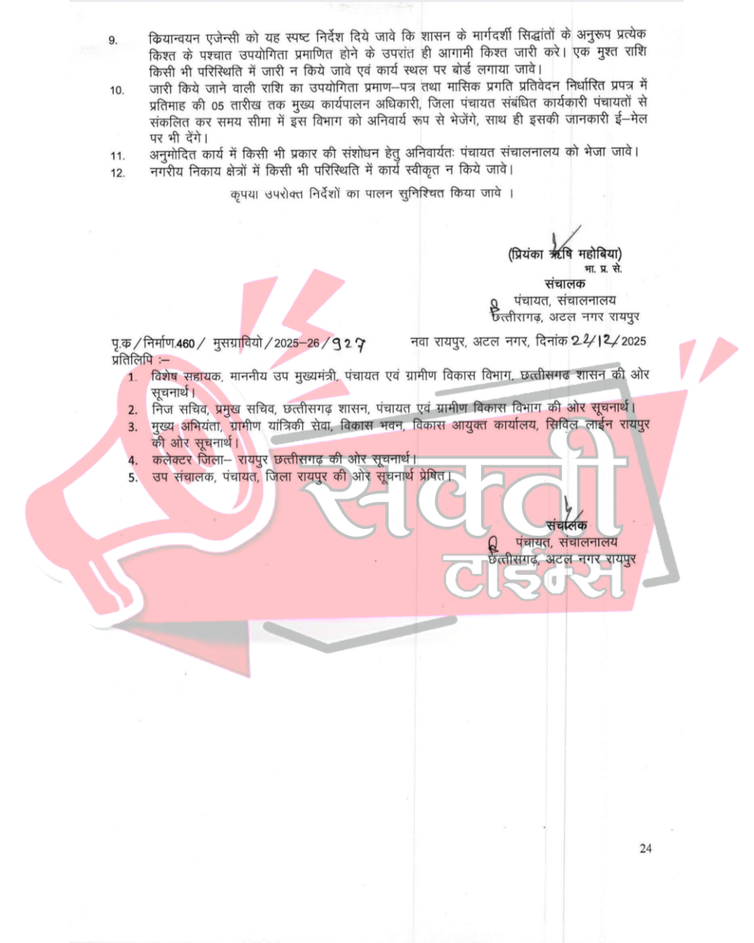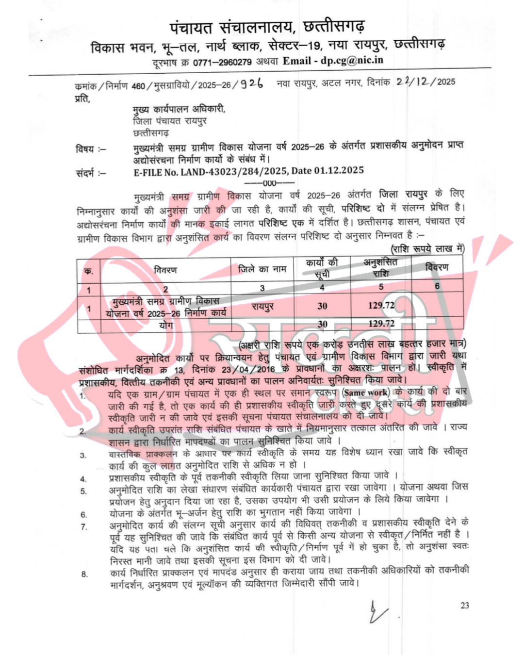 - धार्मिक एवं अन्य कार्य: कुटेसर के विभिन्न तालाबों में ₹7.80 लाख की लागत से निर्मला घाटों का निर्माण और कोडापार में मुक्तिधाम सह प्रतीक्षालय शेड का निर्माण किया जाएगा। गुणवत्ता और पारदर्शिता: मंत्री जी के कड़े निर्देश माननीय मंत्री जी ने स्पष्ट किया है कि निर्माण कार्यों में किसी भी प्रकार की लापरवाही बर्दाश्त नहीं की जाएगी। विभाग द्वारा जारी आदेश में निम्नलिखित शर्तें अनिवार्य की गई हैं: सभी कार्य निर्धारित प्राक्कलन एवं गुणवत्ता के अनुरूप ही कराए जाएंगे। यह सुनिश्चित किया जाएगा कि स्वीकृत कार्य पूर्व में किसी अन्य योजना से निर्मित न हों। कार्य स्थल पर सूचना बोर्ड लगाया जाएगा और प्रत्येक किश्त उपयोगिता प्रमाण पत्र (UC) के बाद ही जारी होगी। मुख्य कार्यपालन अधिकारी, जिला पंचायत को प्रतिमाह प्रगति प्रतिवेदन भेजने के निर्देश दिए गए हैं। इस बड़ी सौगात पर प्रतिक्रिया देते हुए कैबिनेट मंत्री श्री गुरु खुशवंत साहेब जी ने छत्तीसगढ़ के मुख्यमंत्री श्री विष्णुदेव सायं जी एवं उपमुख्यमंत्री(पंचायत एवं ग्रामीण विकास मंत्री) छत्तीसगढ़ सरकार का धन्यवाद ज्ञापित करते हुए कहा कि आरंग विधानसभा के प्रत्येक गांव का सर्वांगीण विकास उनकी सर्वोच्च प्राथमिकता है। मुख्यमंत्री समग्र ग्रामीण विकास योजना के ये कार्य ग्रामीण अर्थव्यवस्था और सामाजिक ढांचे को नई मजबूती प्रदान करेंगे।