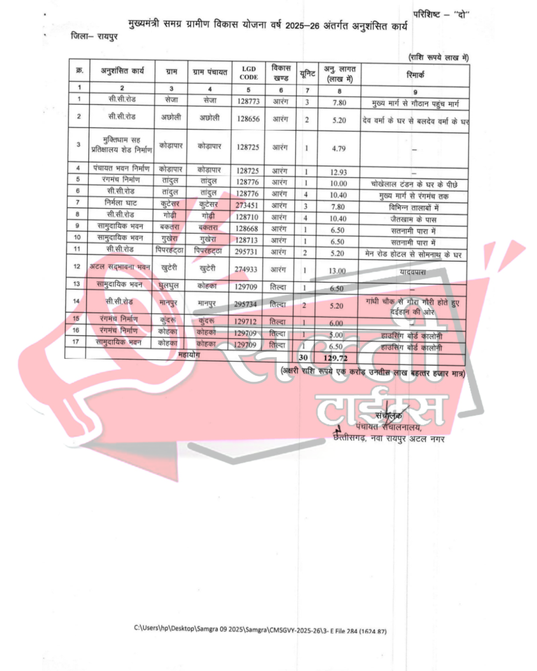 - नवा रायपुर/आरंग/रायपुर छत्तीसगढ़ शासन के माननीय कैबिनेट मंत्री (कौशल विकास, तकनीकी शिक्षा एवं रोजगार, अनुसूचित जाति विकास विभाग) एवं आरंग विधानसभा क्षेत्र के लोकप्रिय विधायक माननीय श्री गुरु खुशवंत साहेब जी के सतत प्रयासों से क्षेत्र में विकास कार्यों की झड़ी लग गई है। मुख्यमंत्री समग्र ग्रामीण विकास योजना वर्ष 2025-26 के अंतर्गत, आरंग विधानसभा और जिले के अन्य ग्रामीण क्षेत्रों के लिए कुल 17 विभिन्न निर्माण में 30 कार्यों हेतु 129.72 लाख रुपये की प्रशासकीय स्वीकृति प्रदान की गई है। प्रमुख निर्माण कार्यों का विवरण: गांव-गांव पहुंचेगी खुशहाली